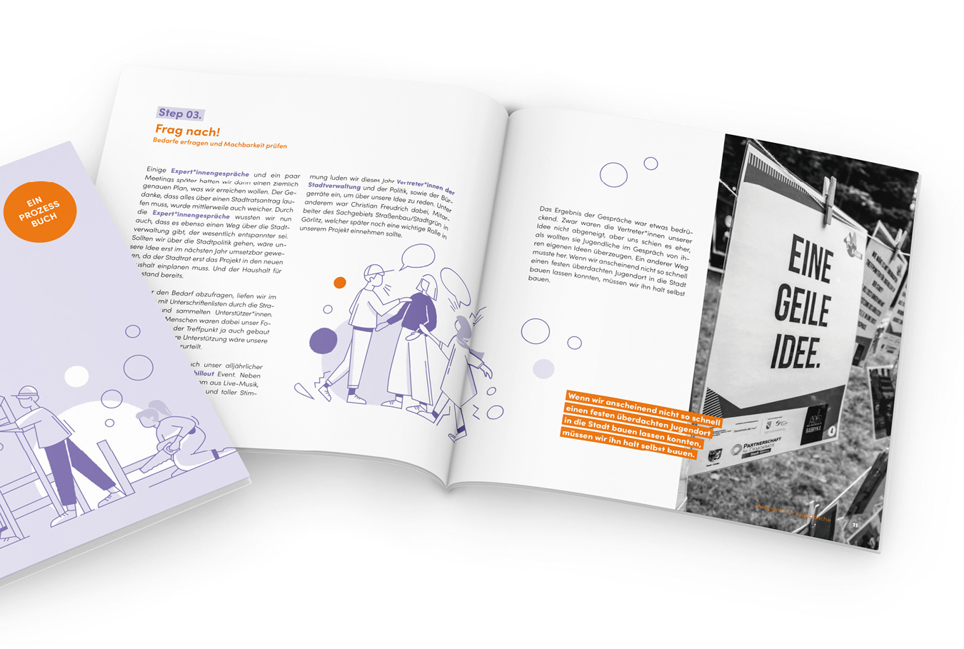 Gestaltung der Broschüre "Prozessbuch Wörfel - Ein Treffpunkt für Jugendliche" inklusive der Entwicklung des Gestaltungskonzepts und Erstellung der Illustrationen.